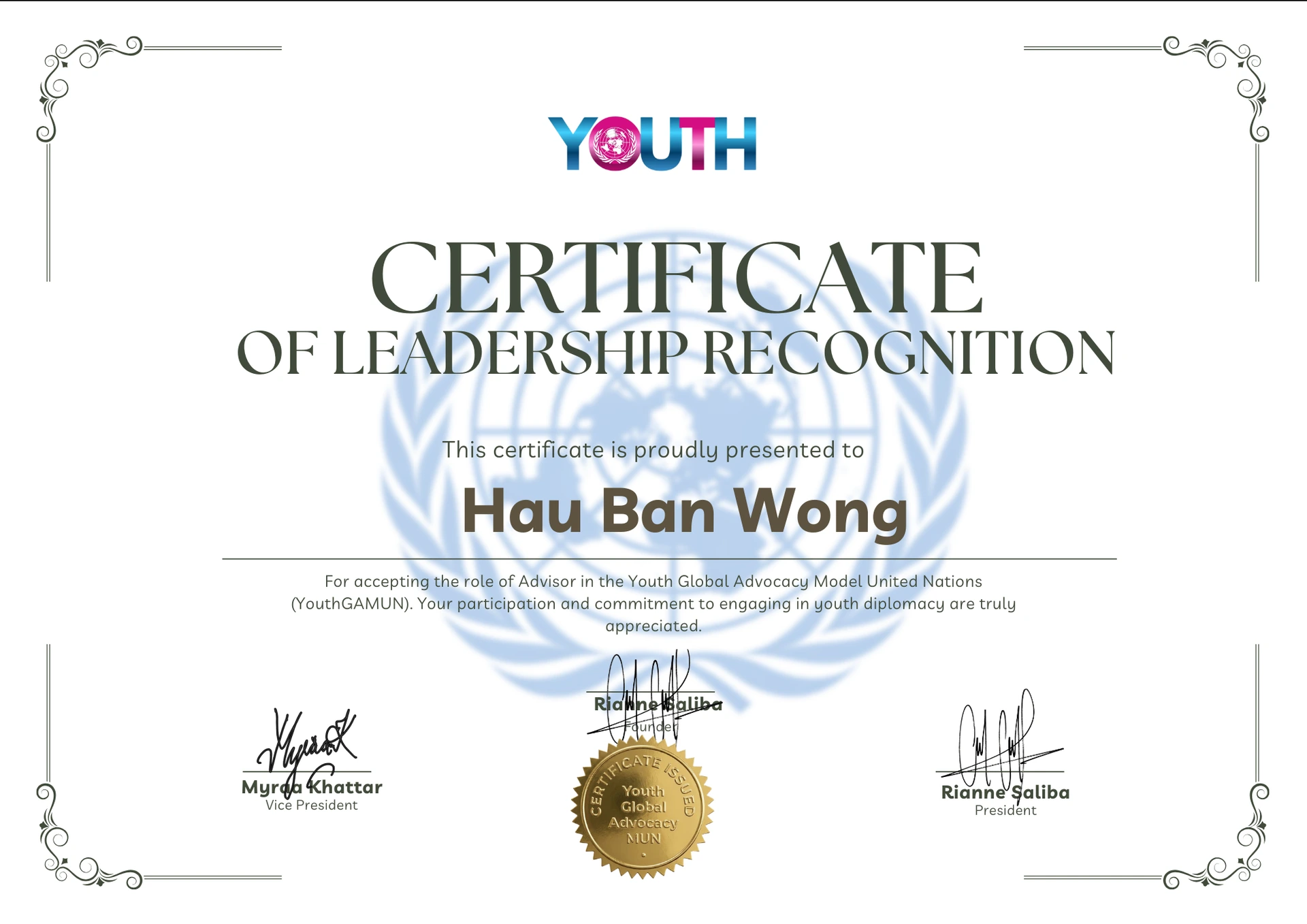 領導力不僅僅是一個職位,更在於賦予他人發聲的力量。我深感榮幸地宣布,我已正式接受 Youth Global Advocacy Model United Nations (YouthGAMUN) 的邀請,出任顧問 (Advisor) 一職。