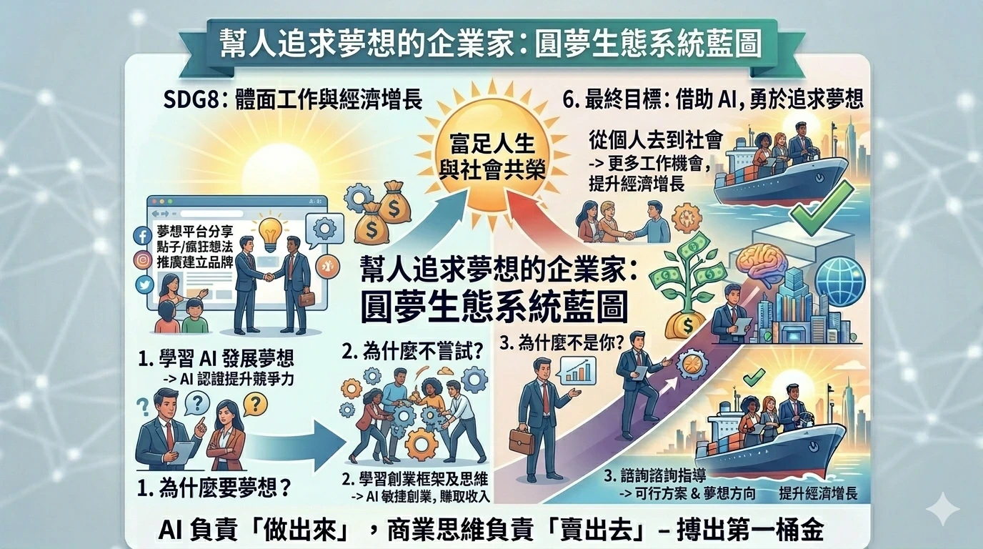 這也是我的承諾。我之所以想成為幫人追求夢想的企業家,是因為我相信,當你學會用 AI 負責「做出來」,用商業思維負責「賣出去」,你所搏出的不僅是「第一桶金」,更是你靈魂的自由與社會的進步。