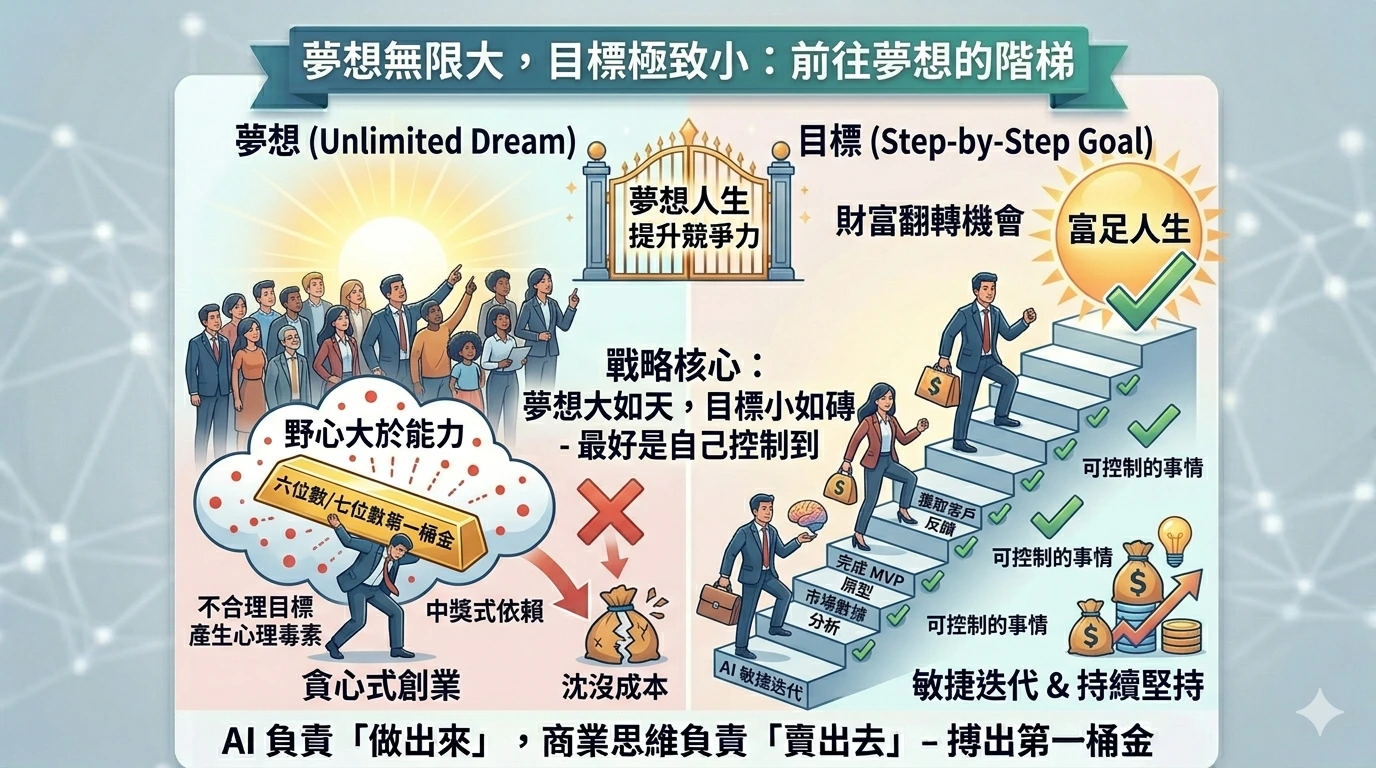 記住:目標是拿來達成的,不是拿來壓碎自己的。 透過 AI 降低開發成本,透過商業思維精準切入市場,將那個「七位數」的大夢想,拆解成一百個「今天就能做完」的小目標。當你走完了這一百個階梯,你會發現,那桶金已經在路口等你了。