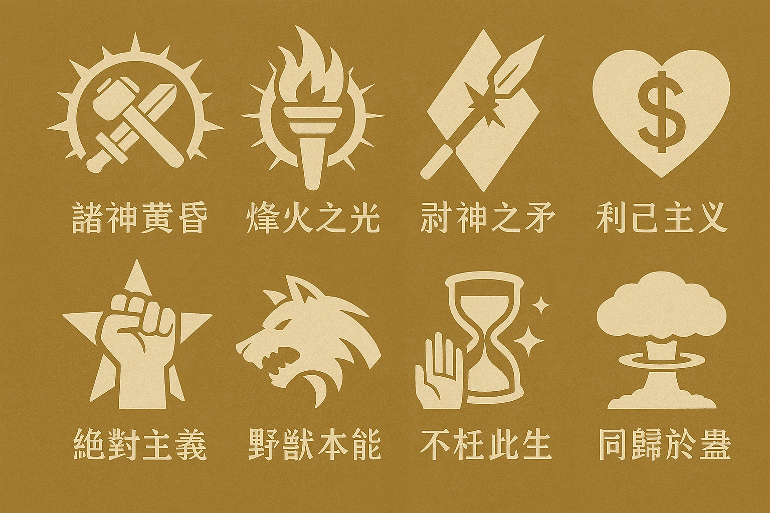 末日取向是獨立選擇的「哲學宿命」,共八種,每種提供全技能加成(特定類+50%)、專屬能力與「末日值」條(滿值觸發絕境變身)。取向不綁定技能類,可任意搭配。選擇後不可變,影響盟友偏好與結局(e.g. 利己主義難組隊)。