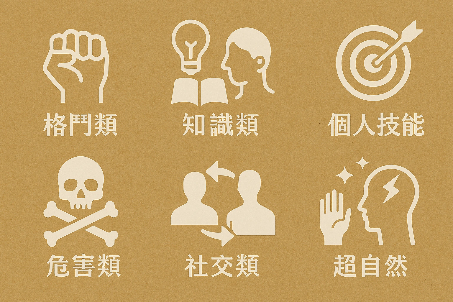 技能分為八大類別,共計70+細項技能。每類技能等級1–15(1=新手,15=傳奇),總點數限100。成長公式:使用次數×類別係數(格鬥/危害×2,知識/求生×1,其他×1.5)。交叉應用解鎖combo(如格鬥+危害=致命連擊)。