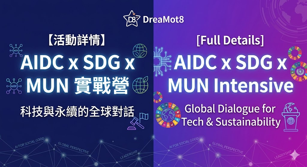 DreaMot8 誠邀您參與這場結合人工智慧(AI)、聯合國永續發展目標(SDG)與模擬聯合國(MUN)的跨界全日實戰營。我們將帶領您深入探索 AI 科技與全球議題的交匯點,透過 MUN 實戰演練,鍛鍊談判、溝通與問題解決能力。從創新工作坊到夢想實踐家的經驗分享,這將是您開啟變革之旅的最佳契機!
